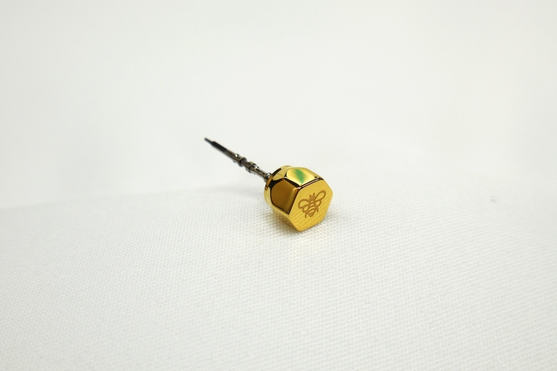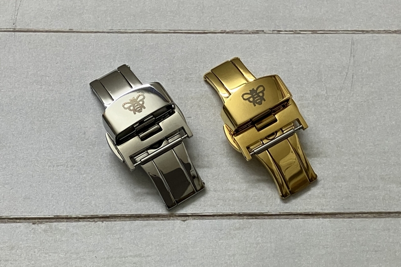 質感はしなやかかつ軽量で、非常に腕馴染みが良いです。ワンポイントとして、6時側にミツバチのマークが入れられています。