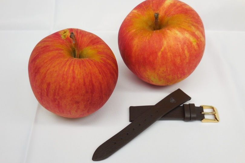 ベルトの素材には「アップルレザー」を採用しました。廃棄されるリンゴを加工して作られた植物由来のヴィーガンレザーで、環境・動物にも配慮しています。