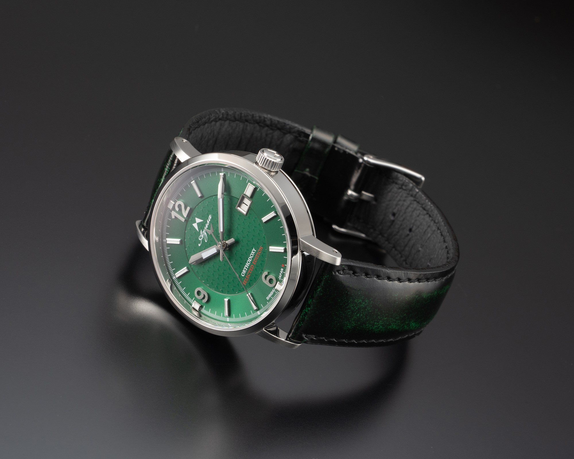 付属のベルトは文字盤のカラーに合わせたグリーンの光沢のある革ベルト。