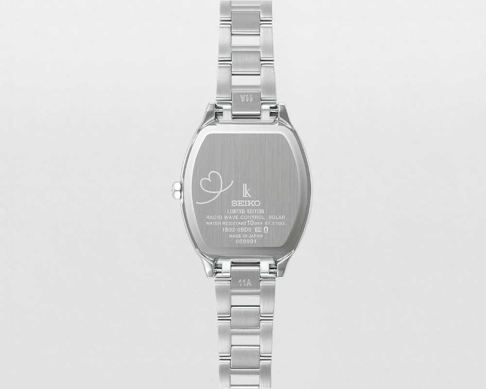 本作は、Happy Collectionのロングセラーであるトノー型をベースモデルに採用し、「愛にあふれる時間」をイメージしたデザインのダイヤルに仕上げました。白蝶貝ダイヤルに、愛の象徴であるハートマークをふんだんにレイアウトしています。また、7時位置には四つ葉のクローバーとクレサンベール(※1)の赤いルビーを配置。クローバーは4つのハートマークを組み合わせたデザインで、幸運が訪れるよう願いを込めました。光が当たる角度によって、ハートマークと四つ葉のクローバーが手元で繊細に煌めきます。また、セーブ・ザ・チルドレンのロゴカラーにも使用されている赤色を差し色にして、オリジナルのアラビアフォントや秒針などを彩りました。そして、裏ぶたにもハートマークがデザインされています。