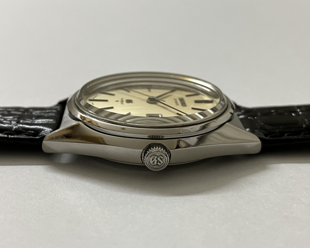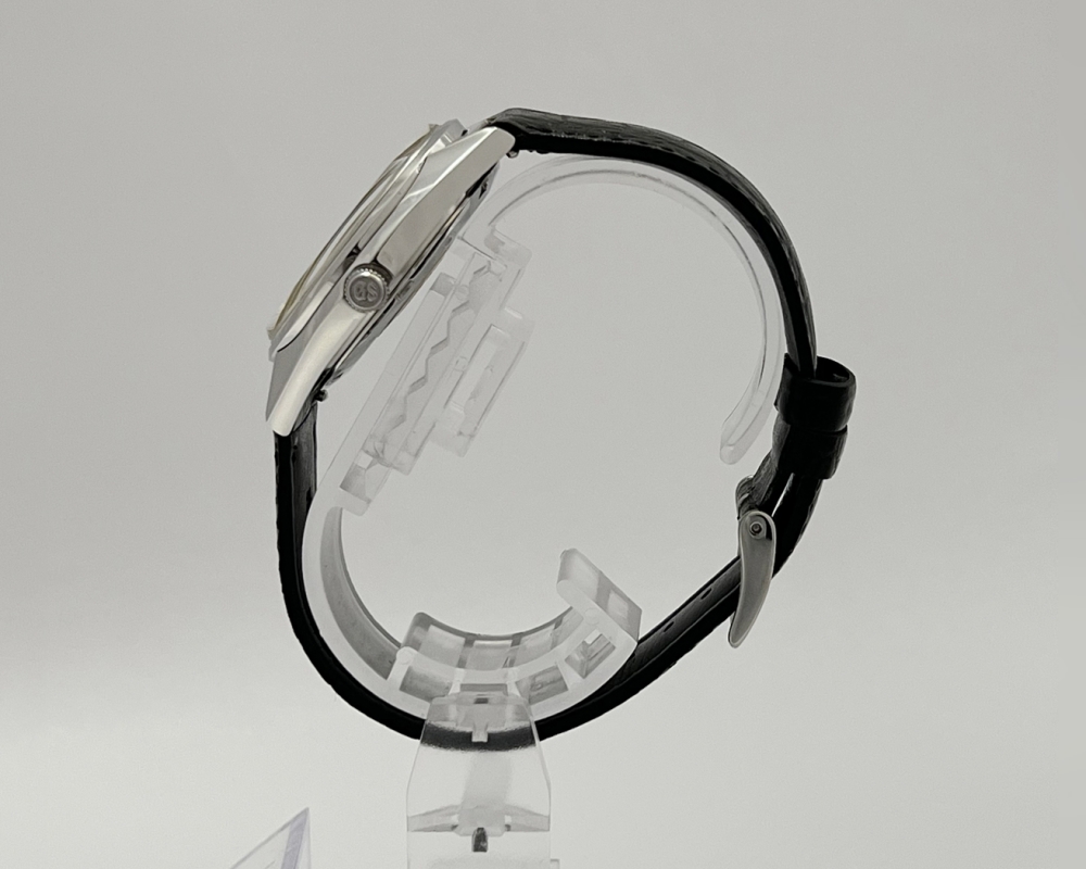 こちらはGS定番の飽きのこないシンプルなシルバーケースに、クリーム色の文字盤、細めのバーインデックスの文字盤の組み合わせ。